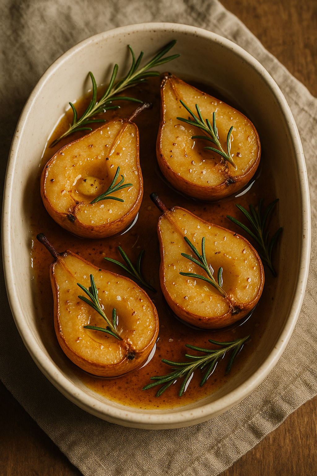 Sous la chaleur du four, la poire se métamorphose : sa chair se gorge de miel, s’imprègne du parfum du romarin et s’enrobe d’un jus ambré qui rappelle les soirs d’automne.